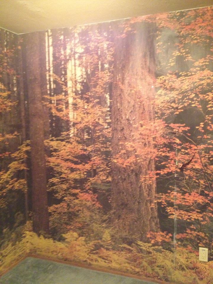 Bedroom 2 with wood paneling, forest wallpaper and wood shelving