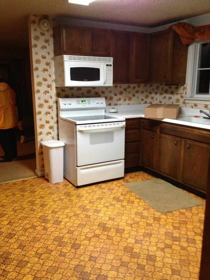 The couple before us lived in our house for about 50 years, raised a family and retired here. They are in their 80’s now and moved to an assisted living. When we first looked at the house it was obvious that there hadn’t been any updates in quite some time. It was as if it were stuck in the 70’s. From the terrible yellowish orange floor and wallpaper in the kitchen, to the wood paneling that lined a majority of the walls, the “forest” wallpaper (which was actually just paper stapled to the wall) in one of the bedrooms and the murphy bed bolted to the wall in another one – it needed a lot of help.