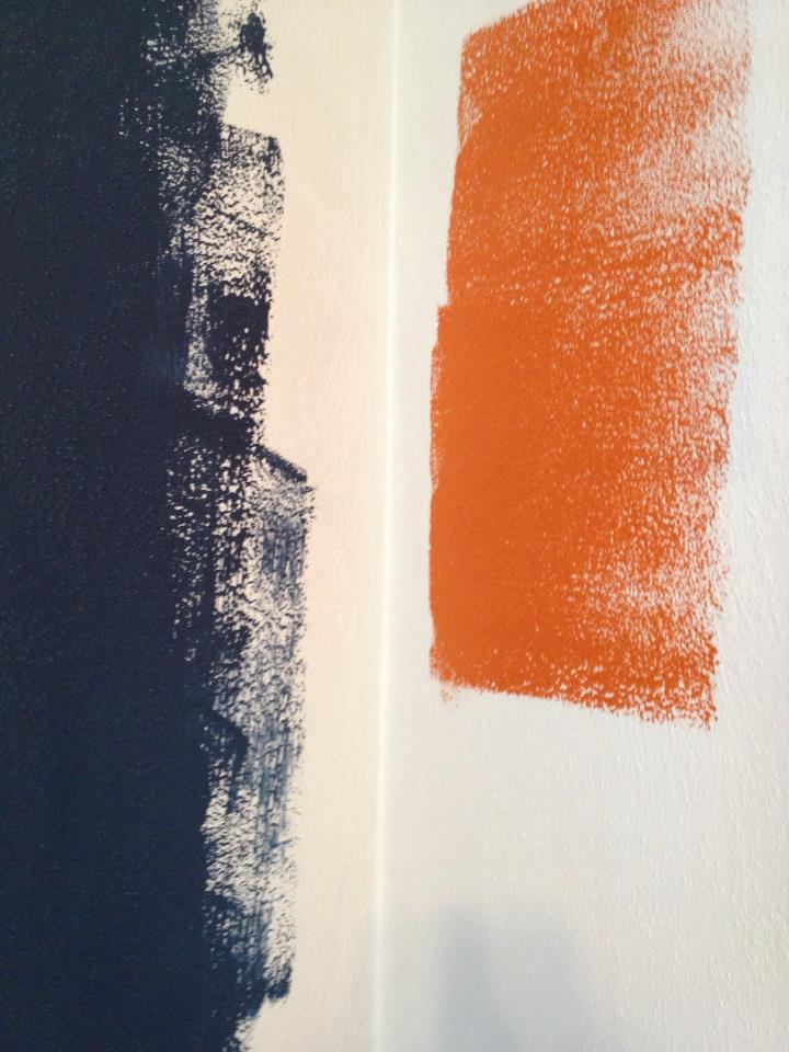 Matt and I had never really had to think about paint before and we didn’t really understand the process of matching colors, etc. For some reason I really wanted a dark blue accent wall and for some reason Matt thought blue and orange sounded good. He showed me a picture in a book we borrowed from his mom and yeah, in the book, it looked good. But what we bought at Home Depot, and what we started painting on our walls, did not.